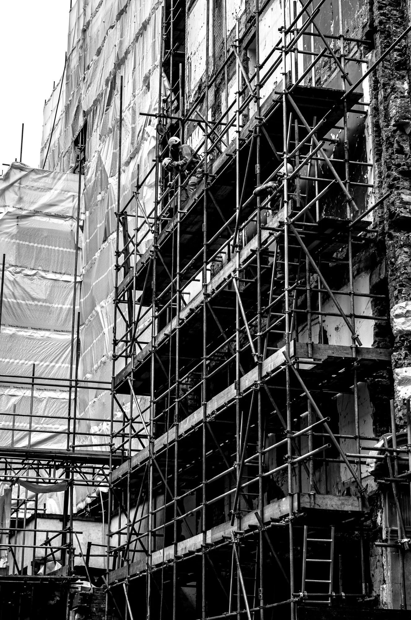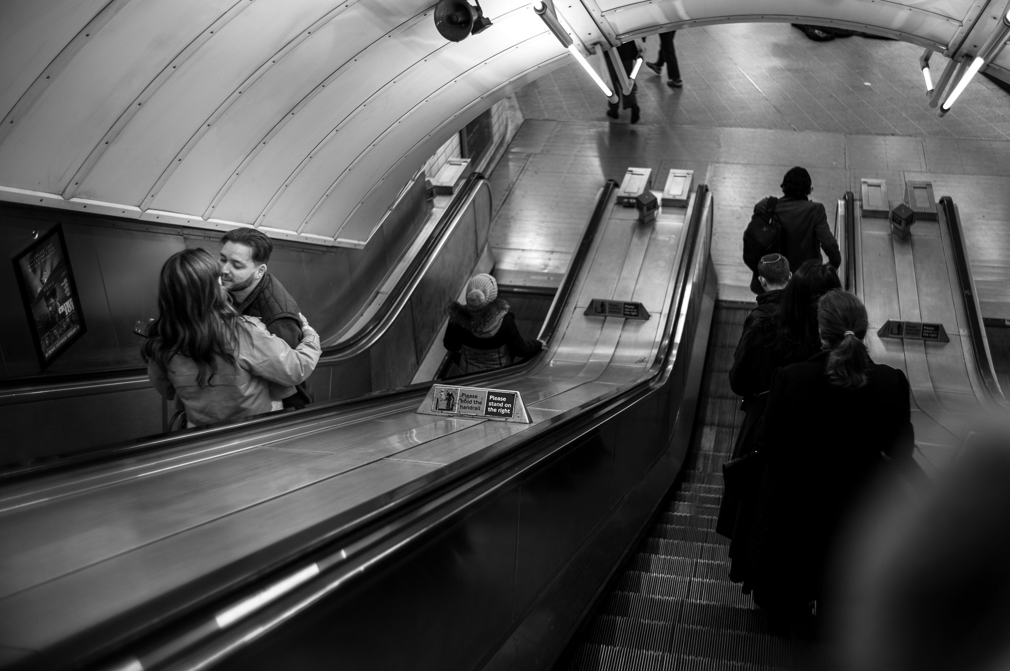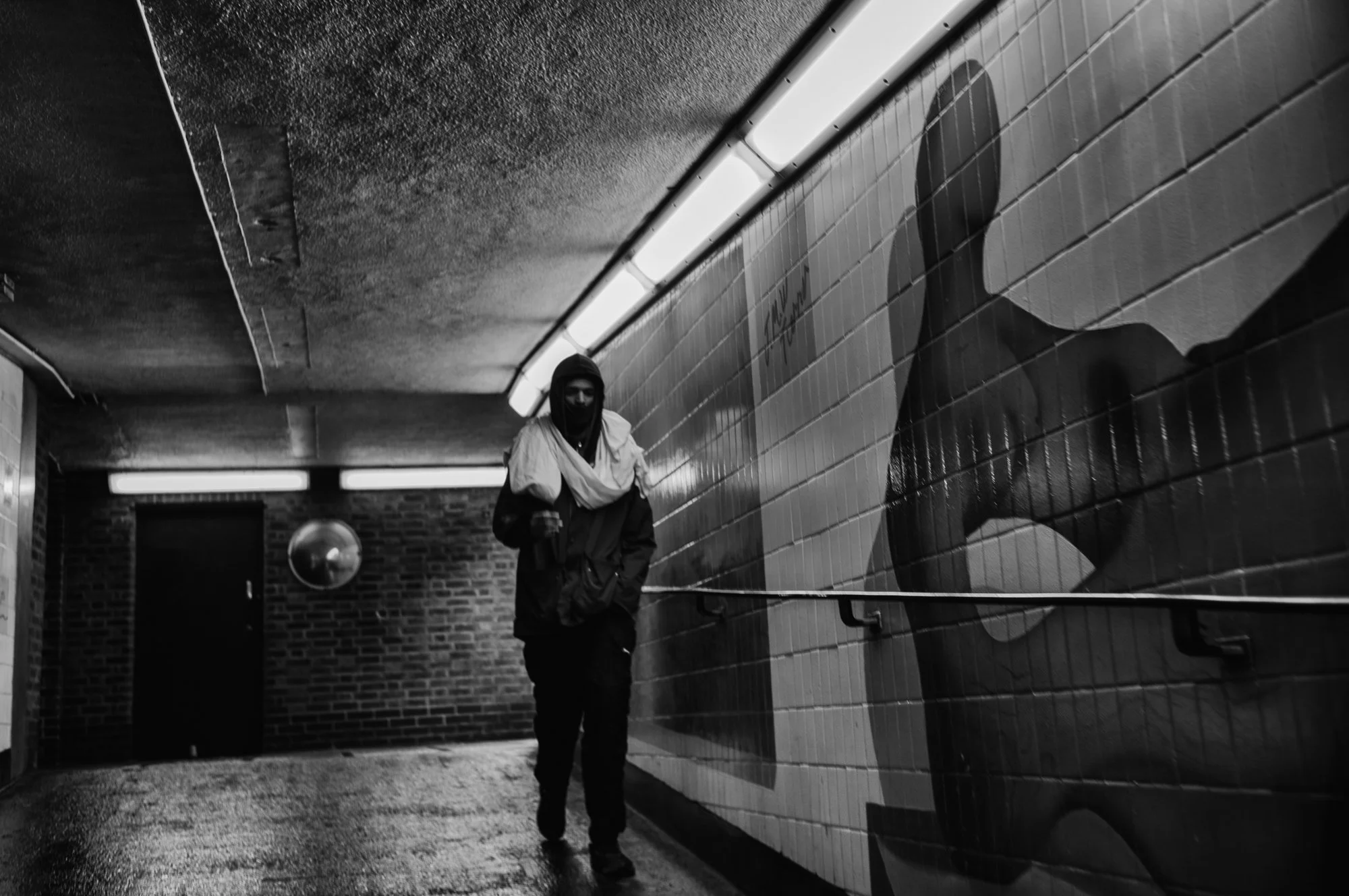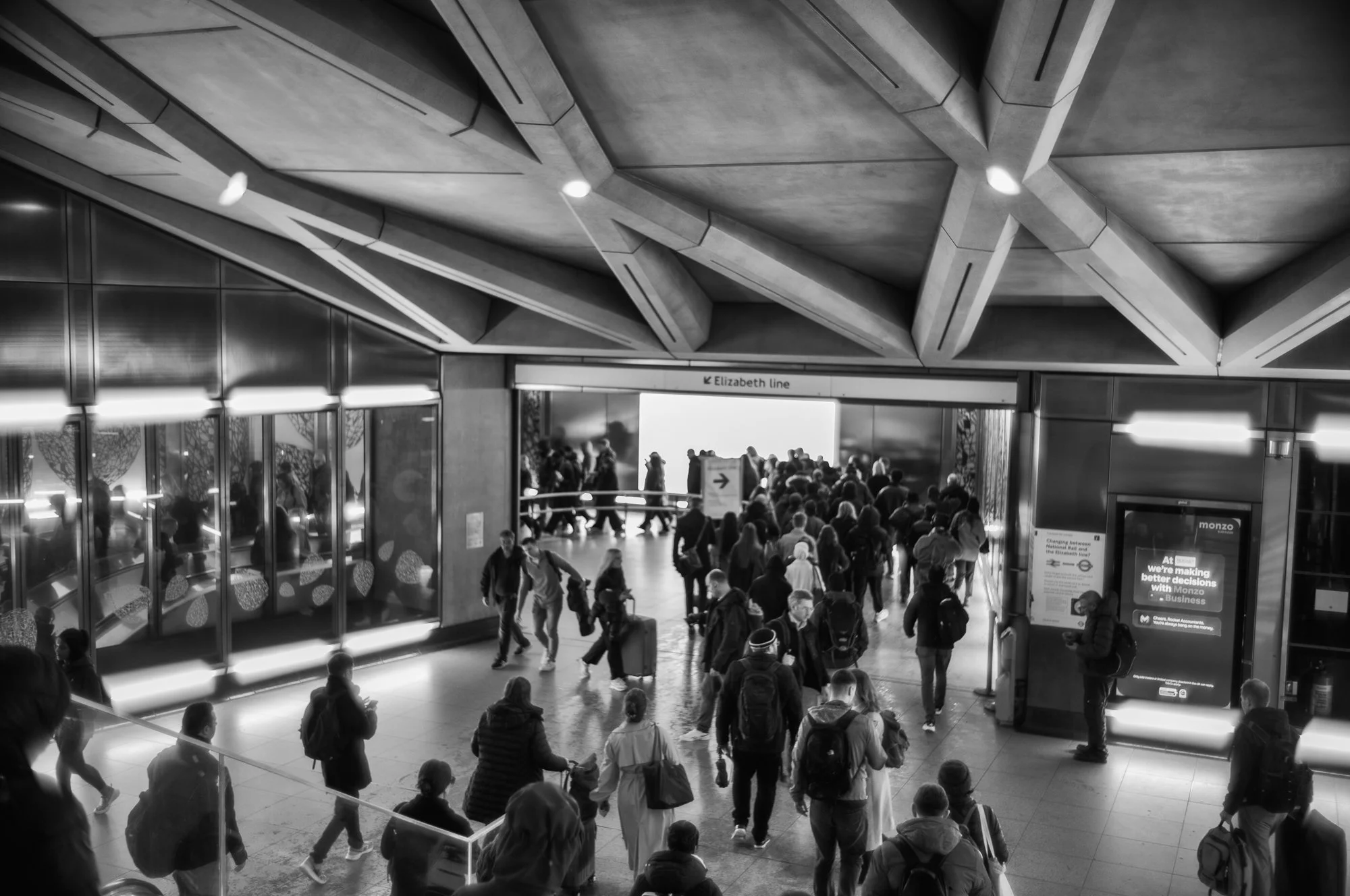 In these images, people appear momentarily held by structure. Walls and ceilings remain constant while figures pass through, absorbed into shadow or briefly illuminated before continuing on. The tension between permanence and transience becomes visible. The built environment endures, but the imprint of each movement is fleeting. What remains is the awareness of scale — and the quiet resilience of those who navigate it daily.